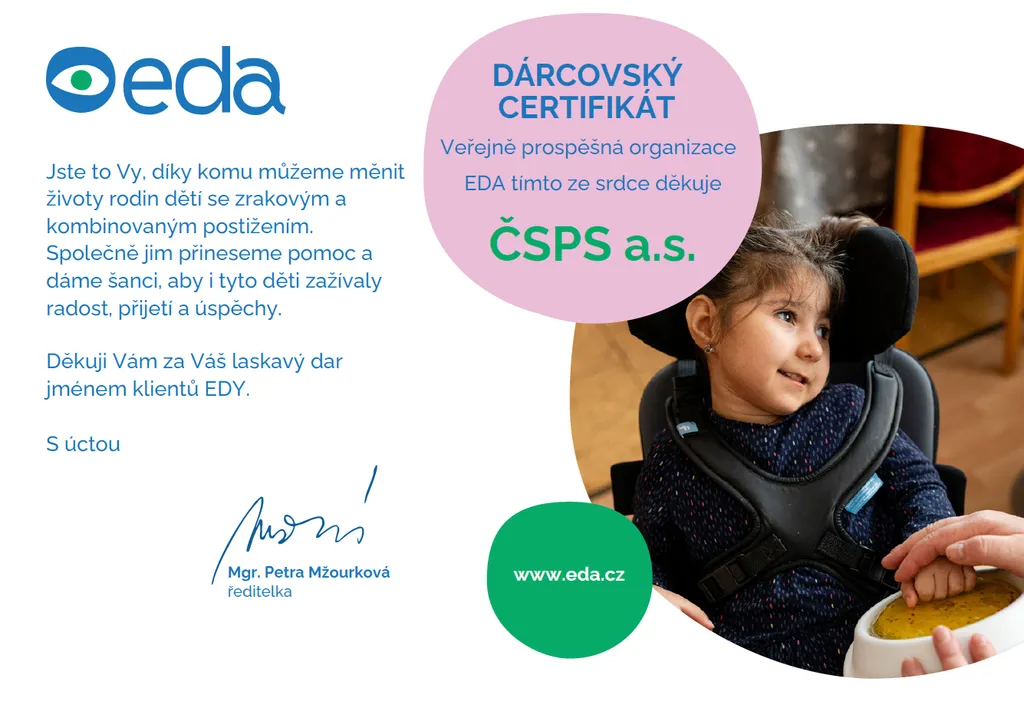 Od poloviny roku 2025 spolupracujeme s organizací EDA, která poskytuje ranou péči rodinám s dětmi se zrakovým či kombinovaným postižením. Do pomoci se zapojujeme jak vlastní dobrovolnickou prací, tak i finančně.